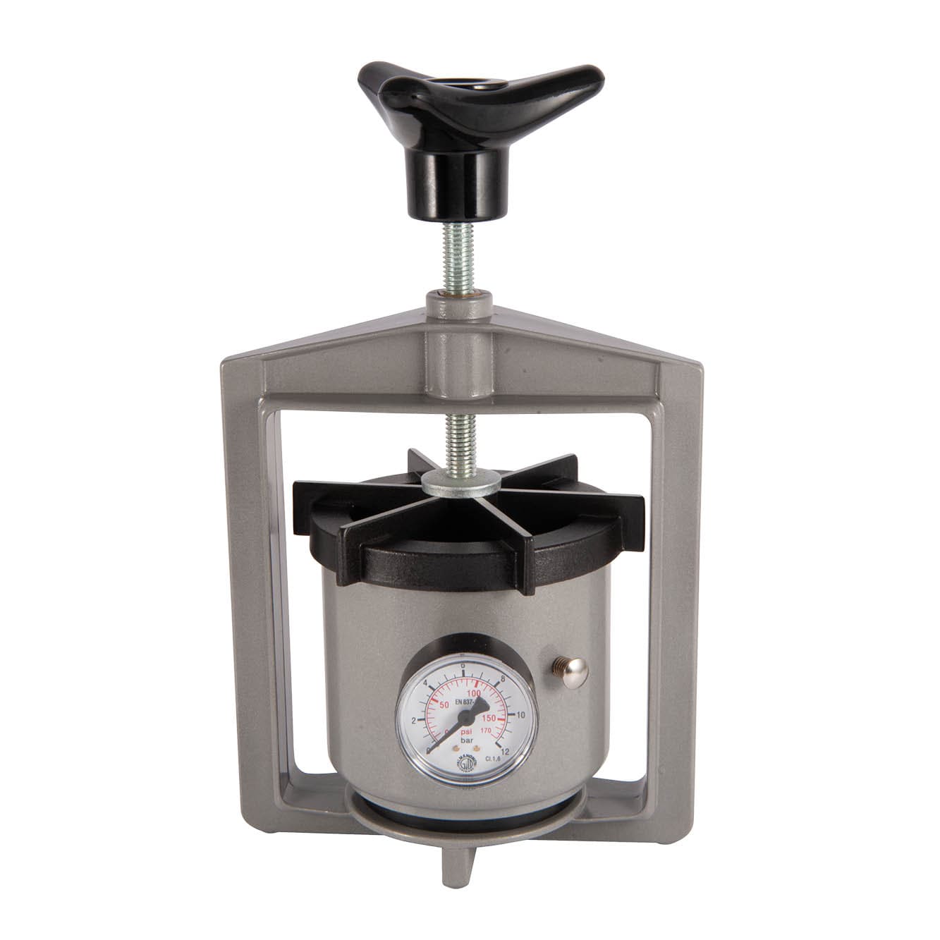 Hydraulic flask press for polymerizing of cold-resins. Practical and safe device operated without compressed air or electricity. Made of die-cast aluminium with double gaskets, upper and lower, to increase the pressure smoothly. Equipped with bracket and relief valve. Suitable for pressing all common flask sizes and forms. All operation elements are clearly arranged and robust. Column distance 140 mm. After the pressure relief valve has been closed the worktable is lifted with the pump lever until the pressure gauge displays the desired pressure. The oil hydraulic system allows a maximum stroke of 25 mm. To protect the flasks from any damage the recommended maximum pressure of 250 kg/cm² should not be exceeded. Internal measurements cm ø10 h9.