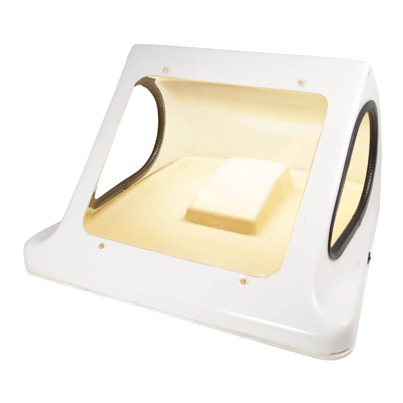 Box for metallic and gold fillings, with led light inside and suction hole, protective glass shield, plastic ergonomic base. Lateral holes 18×13 cm. With suction tube and no-skid adhesive supports