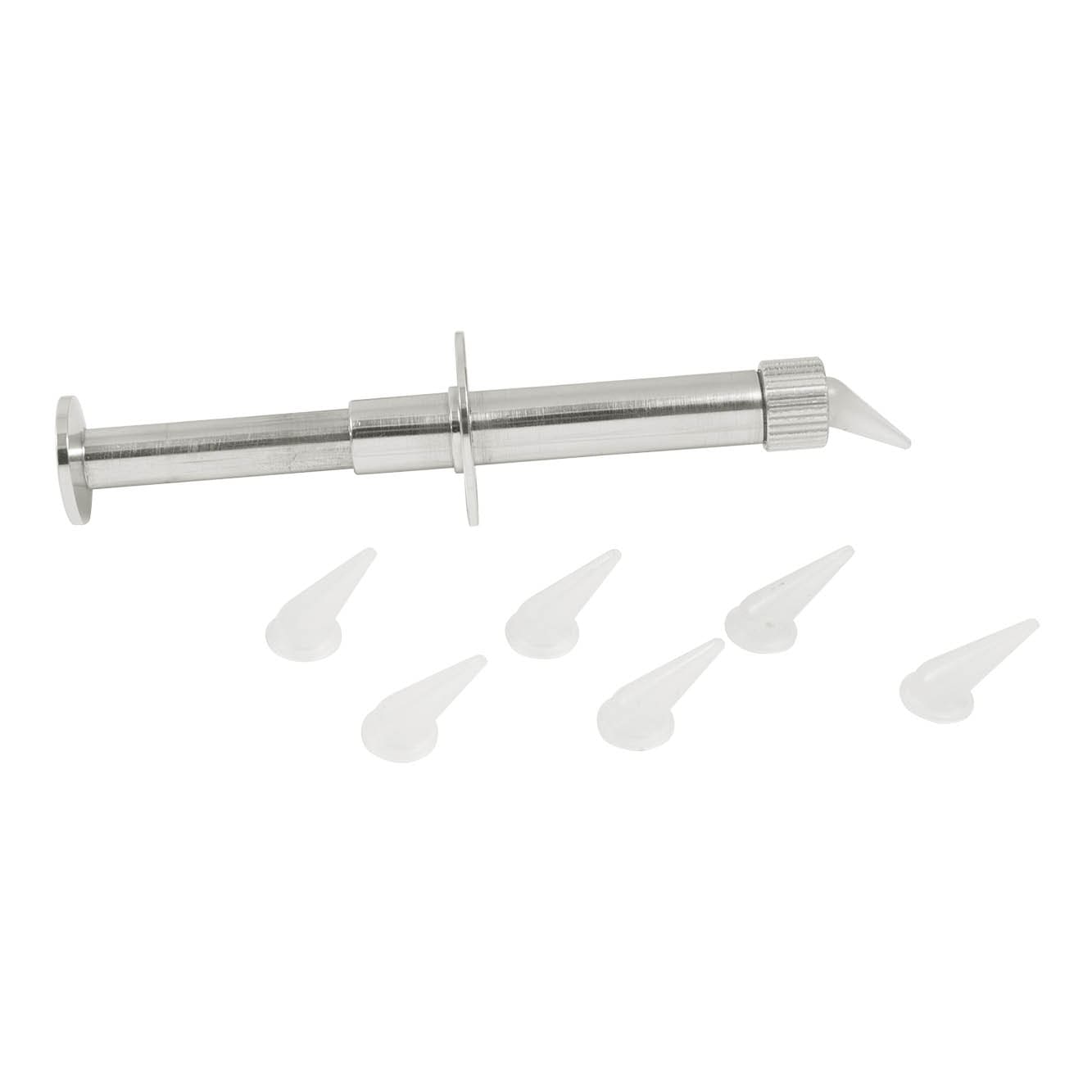Siringa in alluminio anodizzato per elastomeri, fornita con 3 beccucci e o-ring di ricambio e spazzolino per la pulizia.
